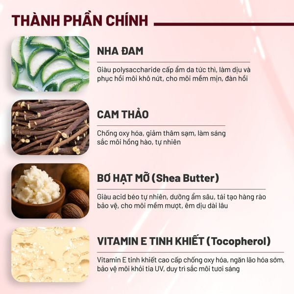 - Chiết xuất Cam Thảo: chứa glycyrrhizin, glabridin và licochalcone - những hoạt chất “ngọc quý” trong dưỡng da từ chiết xuất Cam Thảo, tác dụng chống oxy hóa, kháng viêm mạnh mẽ, bảo vệ da môi khỏi tổn thương do các gốc tự do và môi trường. Đồng thời, thành phần này giúp làm sáng, giảm thâm sạm môi, cải thiện sắc tố cho đôi môi đều màu, hồng hào và rạng rỡ tự nhiên.