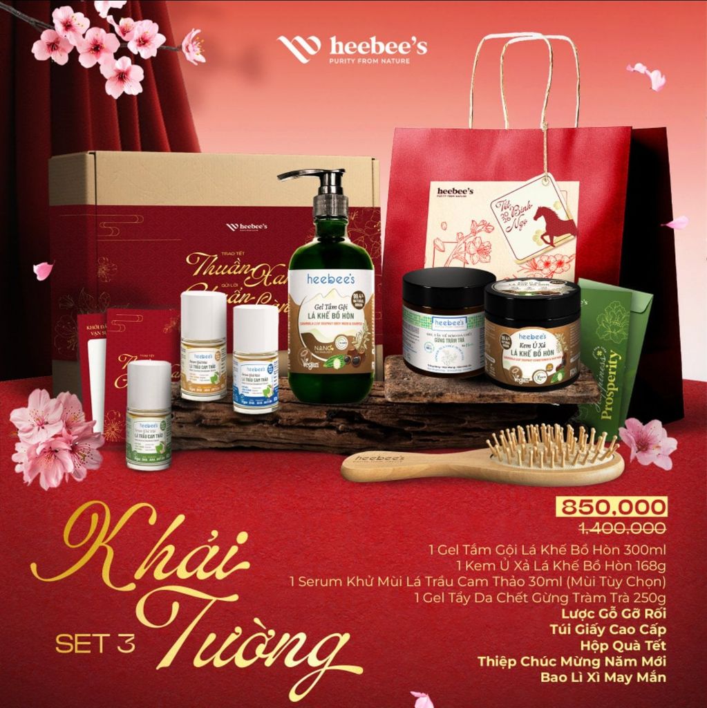 Set quà Tết “Khải Tường” được tạo nên từ tinh thần ấy, kết hợp Gel Tắm Gội Lá Khế Bồ Hòn, Kem Ủ Xả Lá Khế Bồ Hòn, Serum Khử Mùi Lá Trầu Cam Thảo và Gel Tẩy Da Chết Gừng Tràm Trà. Trong đó, bồ hòn - loại quả dân gian từng được dùng để giặt giũ, làm sạch và gội đầu, được xem như biểu trưng cho sự tinh lọc tự nhiên, nhẹ nhàng mà hiệu quả.