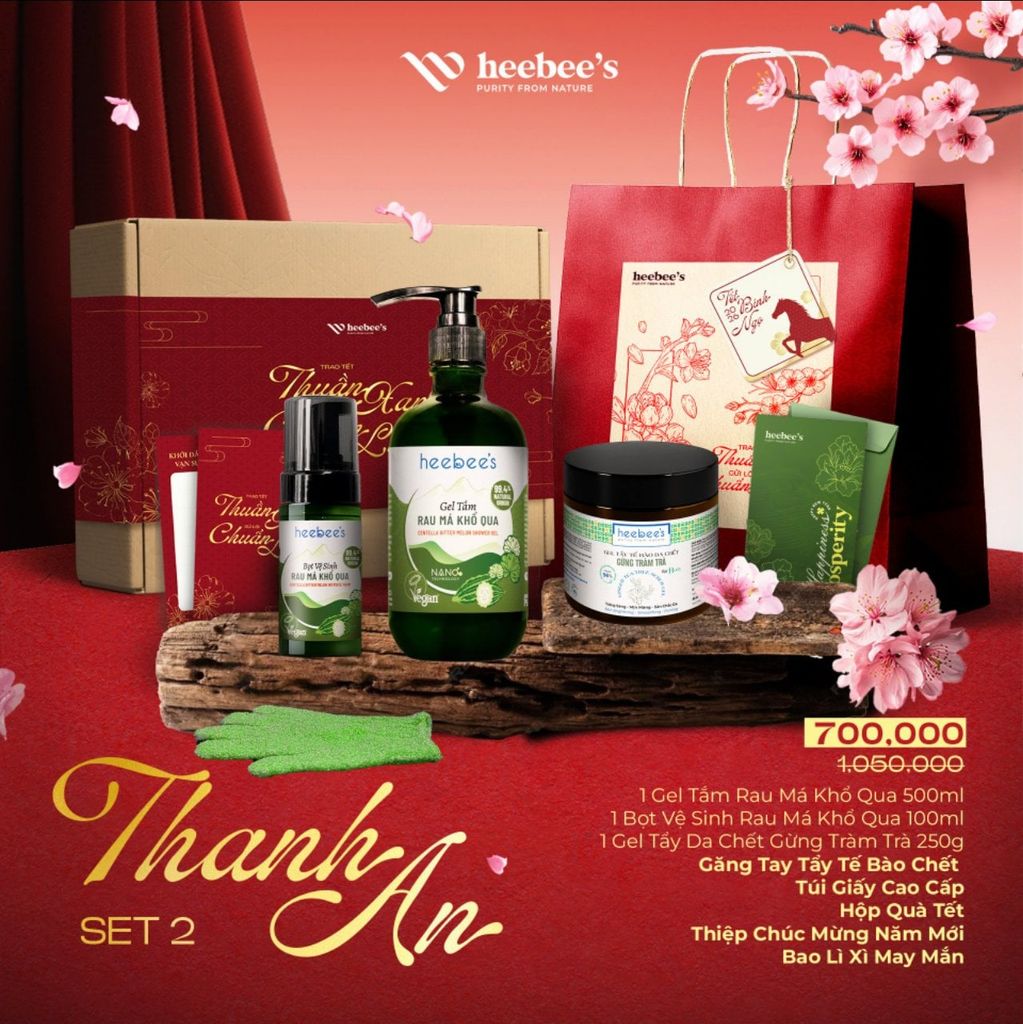 Set quà Tết “Thanh An” của Heebee’s được tạo nên từ tinh thần ấy. Bộ quà bao gồm những Gel Tắm và Bọt Vệ Sinh Rau Má Khổ Qua - hai thành phần gắn liền với sự mát lành, thanh tẩy và ý niệm “qua cái khổ” để đón điều an lành. Đi kèm Gel Tẩy Da Chết Gừng Tràm Trà và Găng Tay Tẩy Tế Bào Chết, “Thanh An” mang đến một trải nghiệm chăm sóc trọn vẹn, nhẹ nhàng nhưng đủ sâu.
