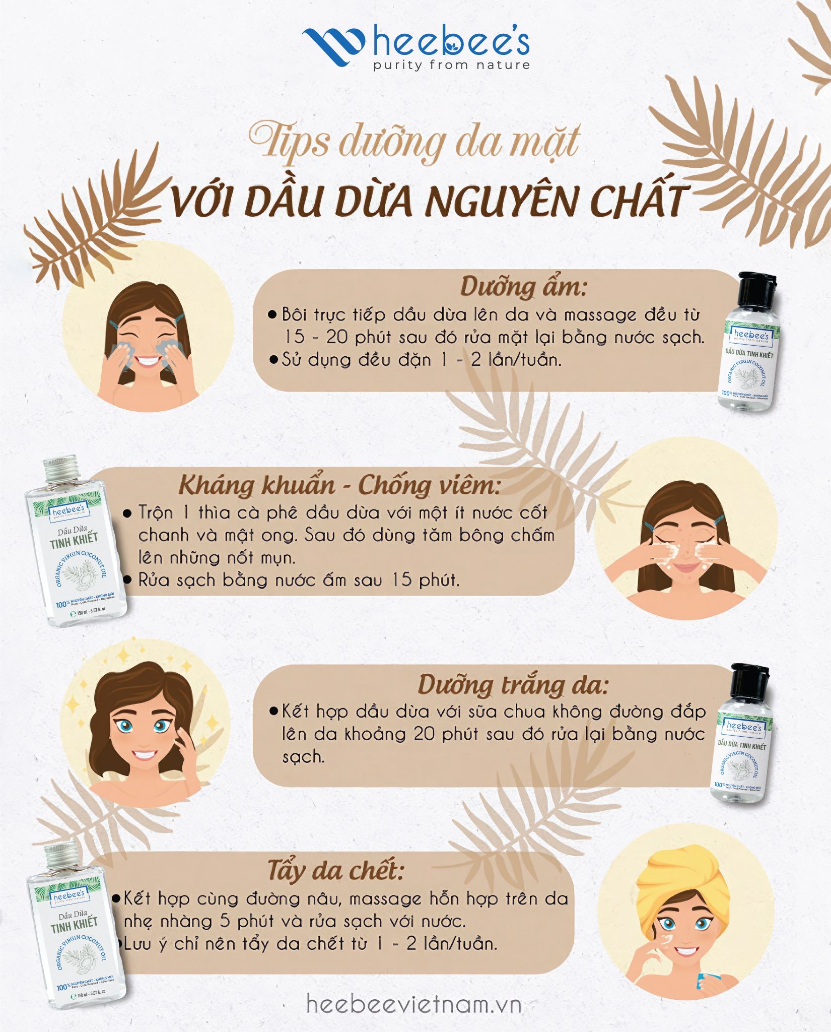 1 – Dưỡng ẩm da: Rửa mặt sạch, thoa 2-3 giọt dầu dừa tinh khiết Heebee lên da và massage nhẹ nhàng, để tẩy sạch bụi bẩn, giúp làn da được dưỡng ẩm đầy đủ, mịn màng. Đối với da dầu, sau khi massage chỉ nên giữ lại trong vòng 20p, sau đó rửa sạch bằng nước, để tránh tình trạng bít kín lỗ chân lông gây ra nhân mụn.