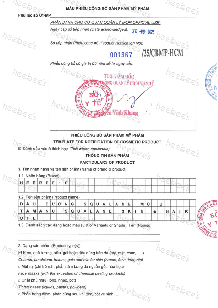 Phiếu Công Bố Mỹ Phẩm được cấp bởi Sở Y Tế