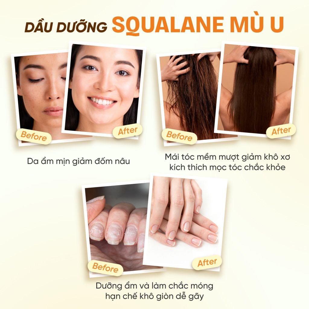 Mỗi giọt Dầu Dưỡng Squalane Mù U là sự kết hợp giữa nuôi dưỡng và trị liệu, mang đến hiệu quả toàn diện cho da, tóc và móng, phục hồi và chống lão hóa cho da/tóc trước các tác nhân xấu từ môi trường xung quanh (ánh nắng, tia cực tím UVA/UVB, nhiệt độ máy sấy,...)