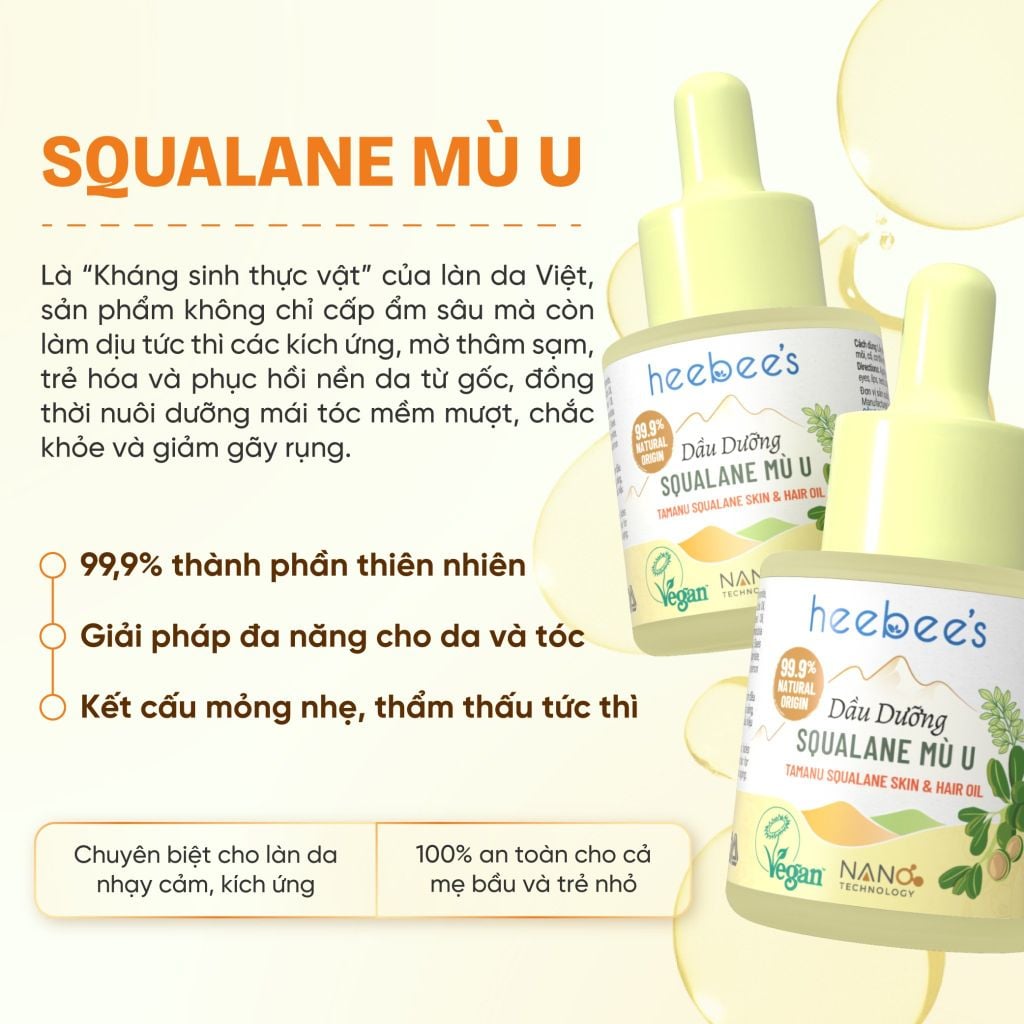 ✨ Sự phối hợp nhịp nhàng của 3 hệ dưỡng chất - Cấp Ẩm & Khóa ẩm, Trị liệu & Tái Tạo, Chống Oxy Hóa & Dưỡng Sáng - chính là bí quyết tạo nên hiệu quả vượt trội, đa năng và bền vững của Dầu Dưỡng Thuần Chay Quốc Dân Squalane Mù U Heebee’s.