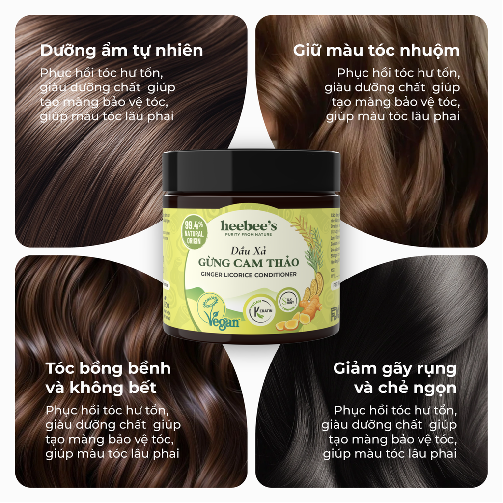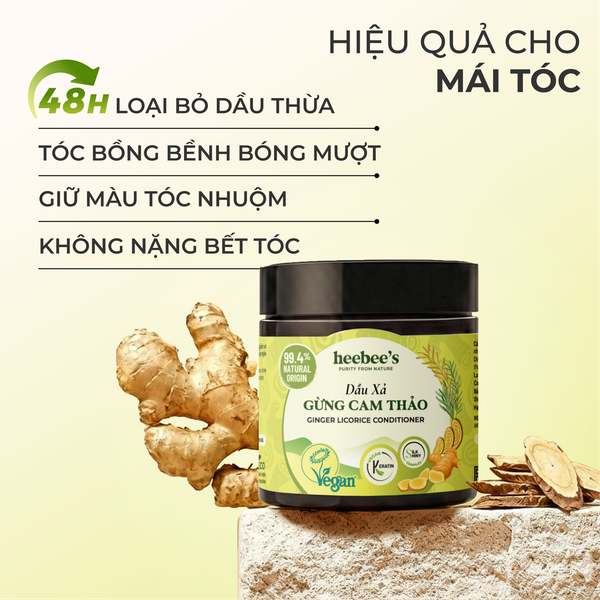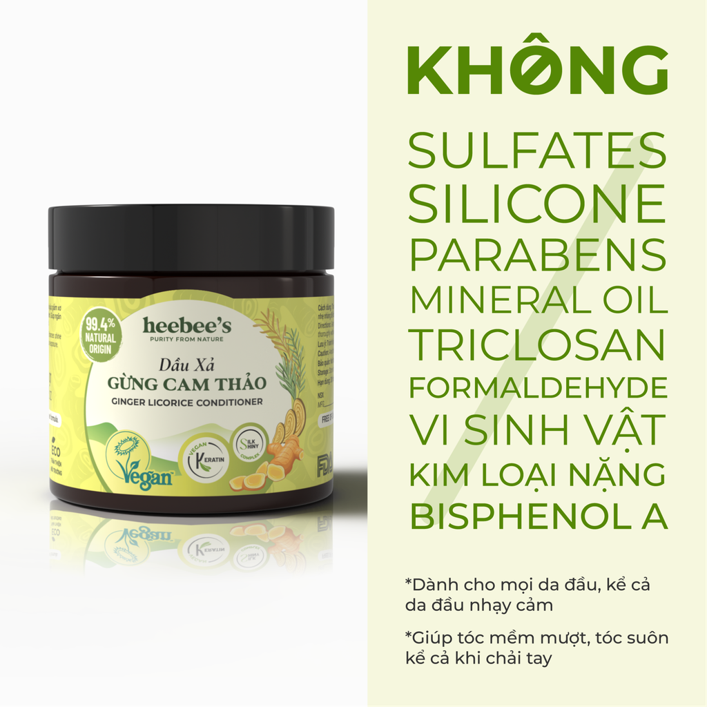 Dầu Xả Gừng Cam Thảo Heebee’s tập trung phục hồi cấu trúc tóc thay vì tạo độ mượt giả. Công thức KHÔNG SILICONE TỔNG HỢP/HÓA HỌC giúp dưỡng chất thẩm thấu trực tiếp vào sợi tóc và da đầu, hỗ trợ củng cố nang tóc, giữ màu tóc nhuộm và cải thiện độ mềm mượt một cách bền vững.