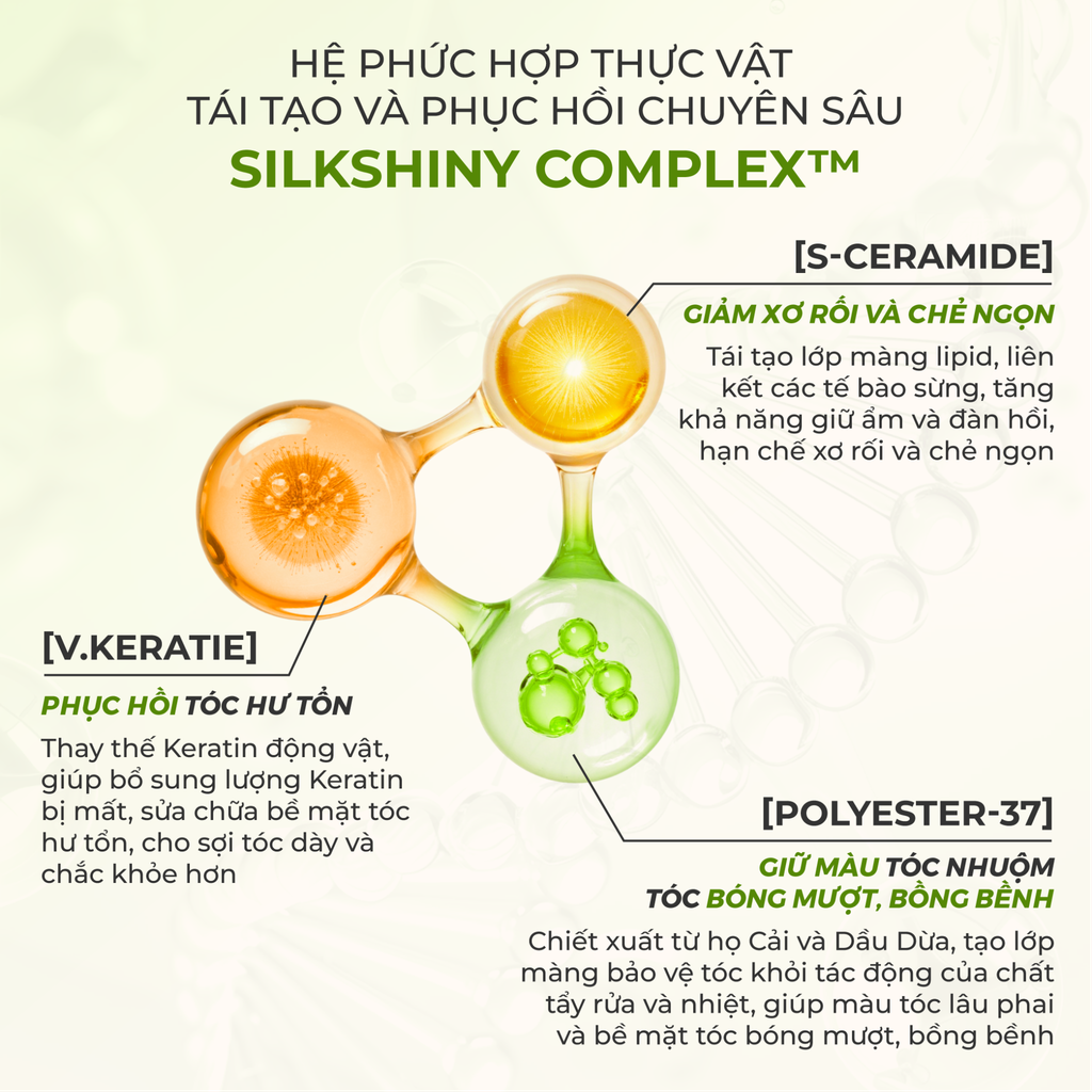 SILKSHINY COMPLEX™: Tập trung phục hồi sợi tóc từ bên trong, bù đắp tổn thương do nhiệt, tạo kiểu và nhuộm màu thường xuyên: