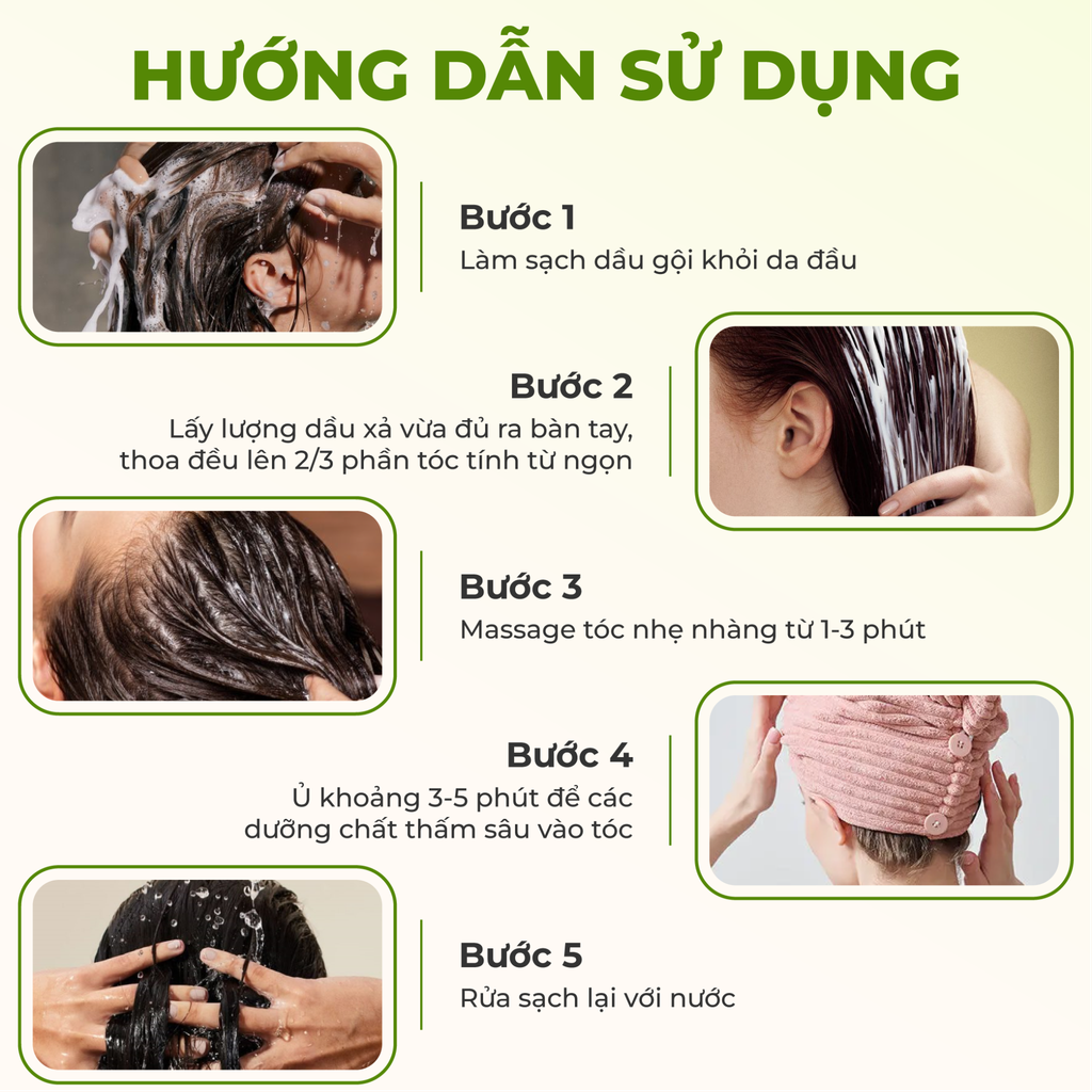 - Thoa & massage nhẹ: Lấy lượng dầu xả vừa đủ, thoa đều từ thân đến ngọn tóc. Với công thức thảo dược thuần chay dịu nhẹ, có thể massage nhẹ phần chân tóc để thư giãn (tránh chà xát mạnh nếu da đầu nhiều dầu).