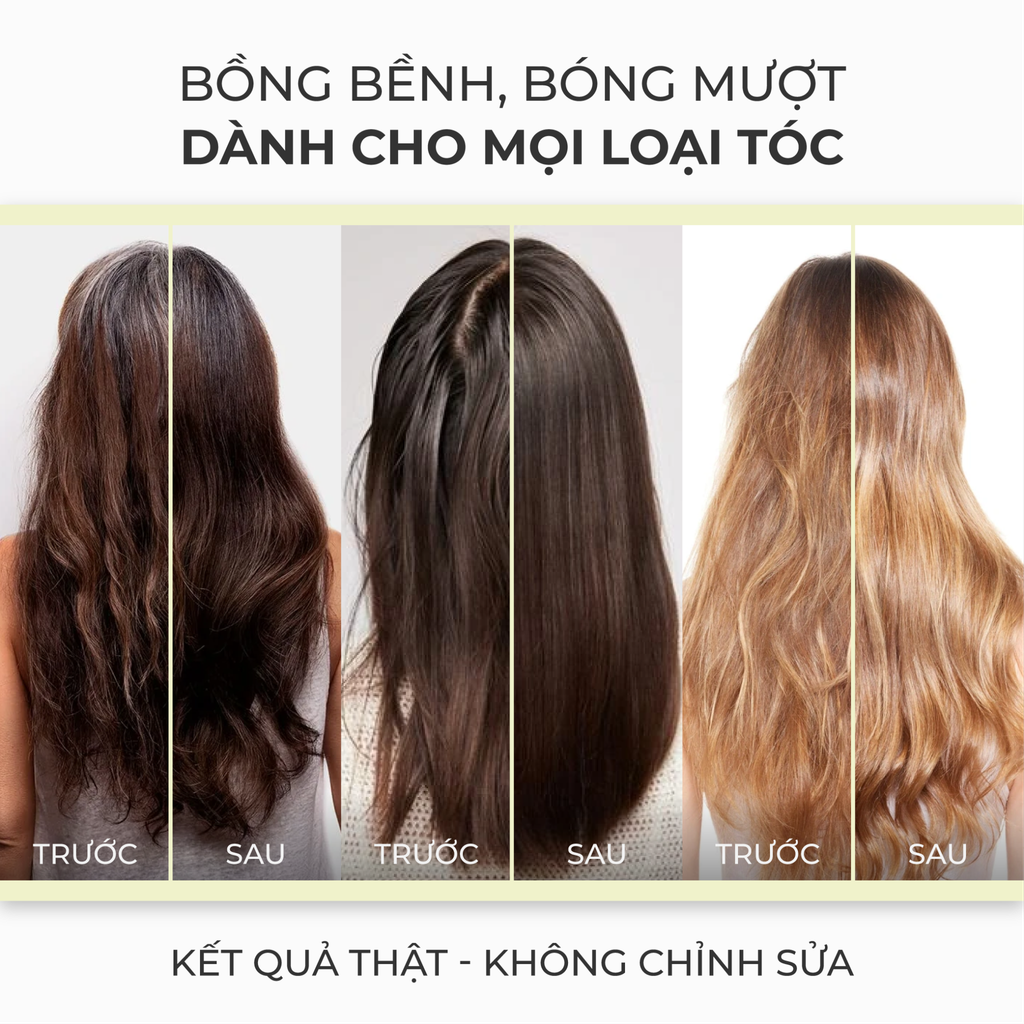- Ủ dưỡng sâu: Ủ tóc từ 3–5 phút để các hoạt chất dưỡng thẩm thấu sâu và bao bọc đều sợi tóc, giúp tóc mềm mượt và chắc khỏe hơn.