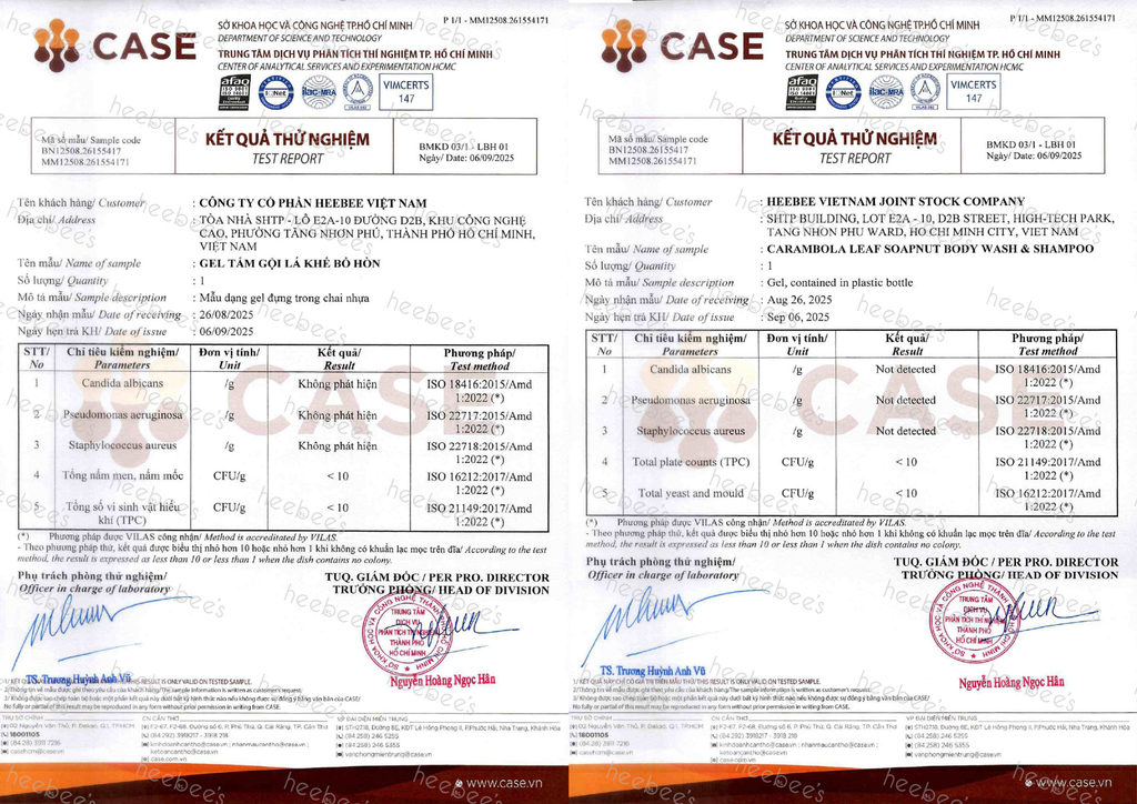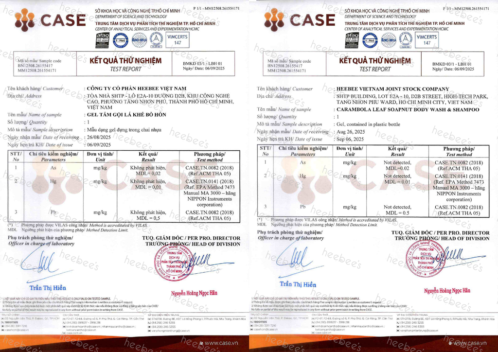 Kết quả kiểm định Gel Tắm Gội LÁ KHẾ BỒ HÒN Không chứa Vi Sinh Vật gây hại và Kim Loại Nặng.