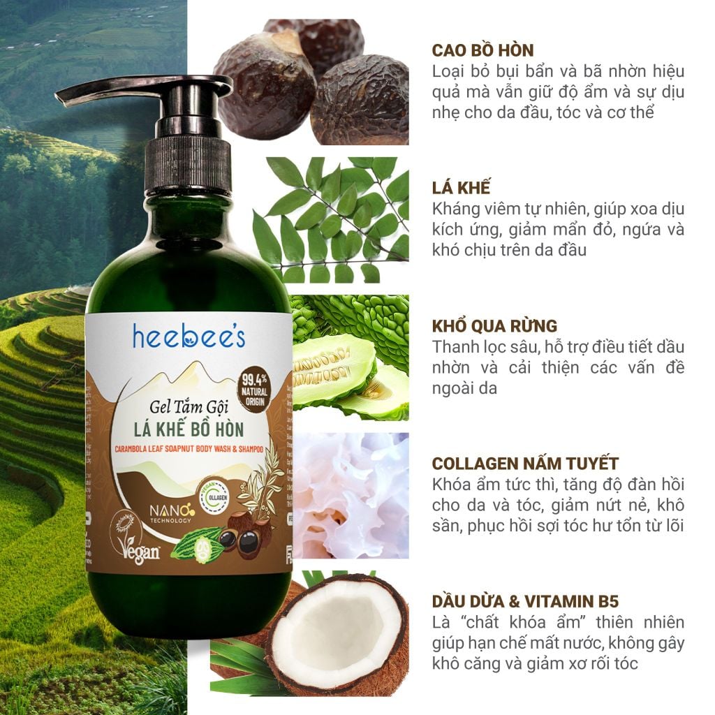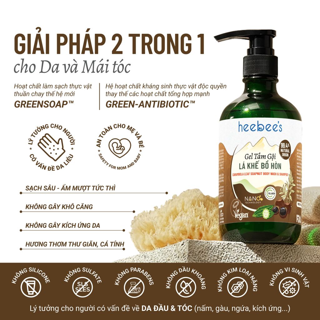 Gel Tắm Gội LÁ KHẾ BỒ HÒN Heebee’s - Sạch Gàu, Giảm Ngứa - Khỏe Tóc, Mượt Da công thức THUẦN XANH – CHUẨN LÀNH đạt chứng nhận Vegan toàn cầu từ Vương Quốc Anh là giải pháp hữu ích cho người tiêu dùng với 3 ưu thế: