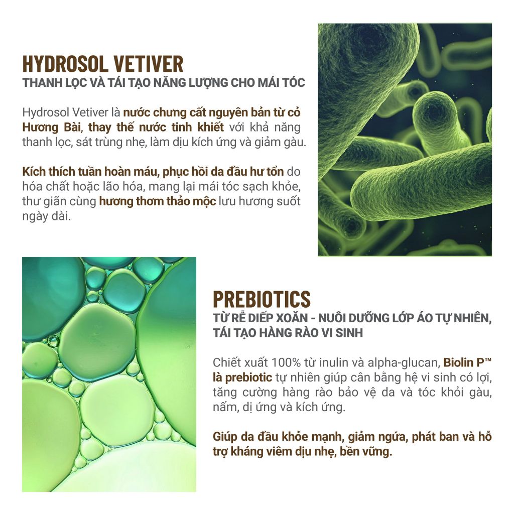 • Nước chưng cất HYDROSOL VETIVER: là nước chưng cất nguyên bản từ cỏ Hương Bài, thay thế nước tinh khiết với khả năng thanh lọc, sát trùng nhẹ, làm dịu kích ứng và giảm gàu. Kích thích tuần hoàn máu, phục hồi da đầu hư tổn do hóa chất hoặc lão hóa, mang lại mái tóc sạch khỏe, thư giãn cùng hương thơm thảo mộc lưu hương suốt ngày dài.