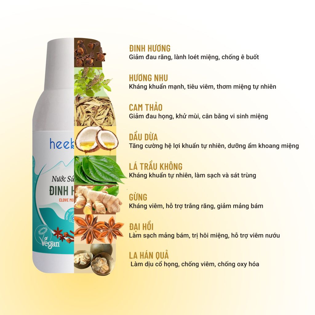 Nước Súc Miệng Đinh Hương Heebee's là thành quả nghiên cứu khoa học của Heebee khi lần đầu tiên ứng dụng Công Nghệ Ion Khoáng cùng 08 loại chiết xuất cô đặc từ 08 loại thảo dược quý cao cấp. Với tâm nguyện khôi phục lại các phương pháp dân gian quý báu của người Á Đông xưa, vừa chọn lọc các thảo dược nổi tiếng trong việc chăm sóc và điều trị các bệnh lý ở vùng miệng bao gồm: Đinh Hương, Lá Trầu Không, Gừng, Cam Thảo, La Hán Quả, Đại Hồi, Hương Nhu và Lạc Tiên.