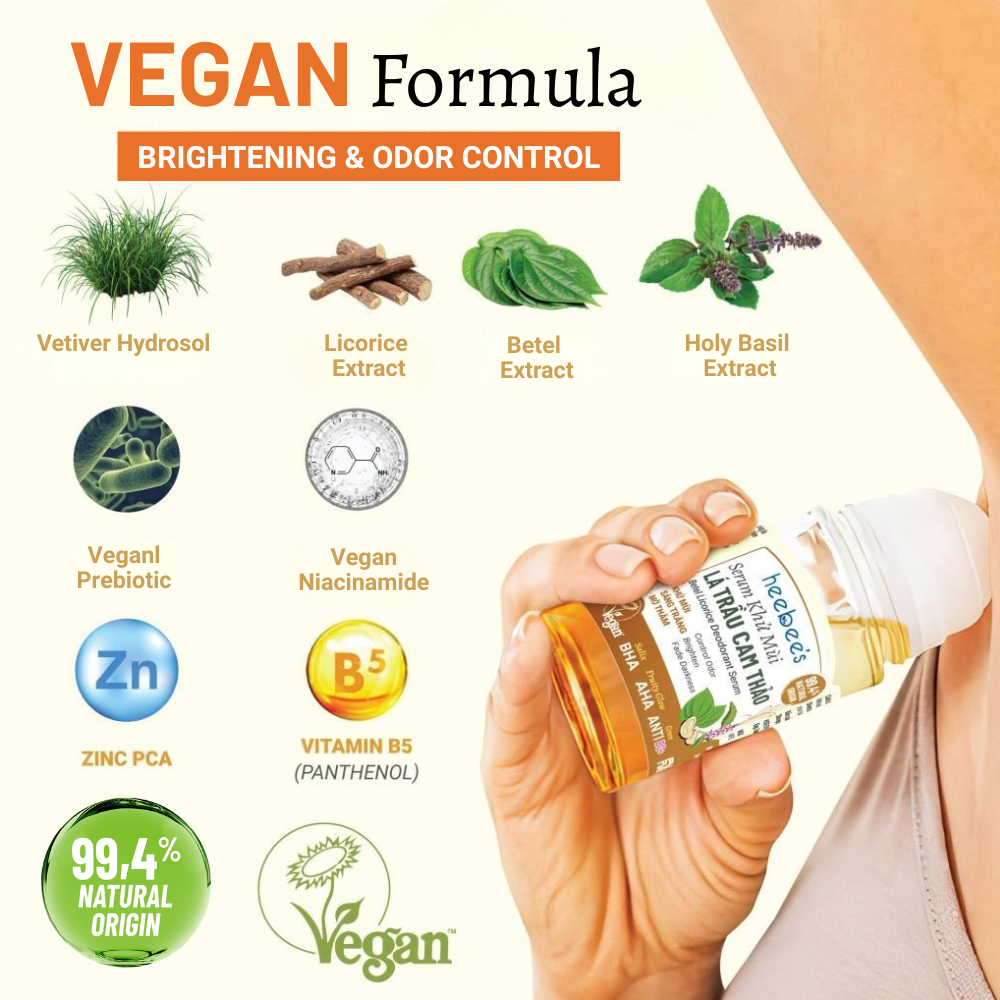 Heebee’s Vegan Betel Licorice Deodorant Serum is the result of successful scientific research by our R&D Team. It uniquely combines native natural extracts (Betel Leaf, Licorice, Holy Basil) on a base of rare Vetiver Hydrosol, creating a New Generation Vegan Deodorant Solution centered on the philosophy: "Less bacteria, less odor."