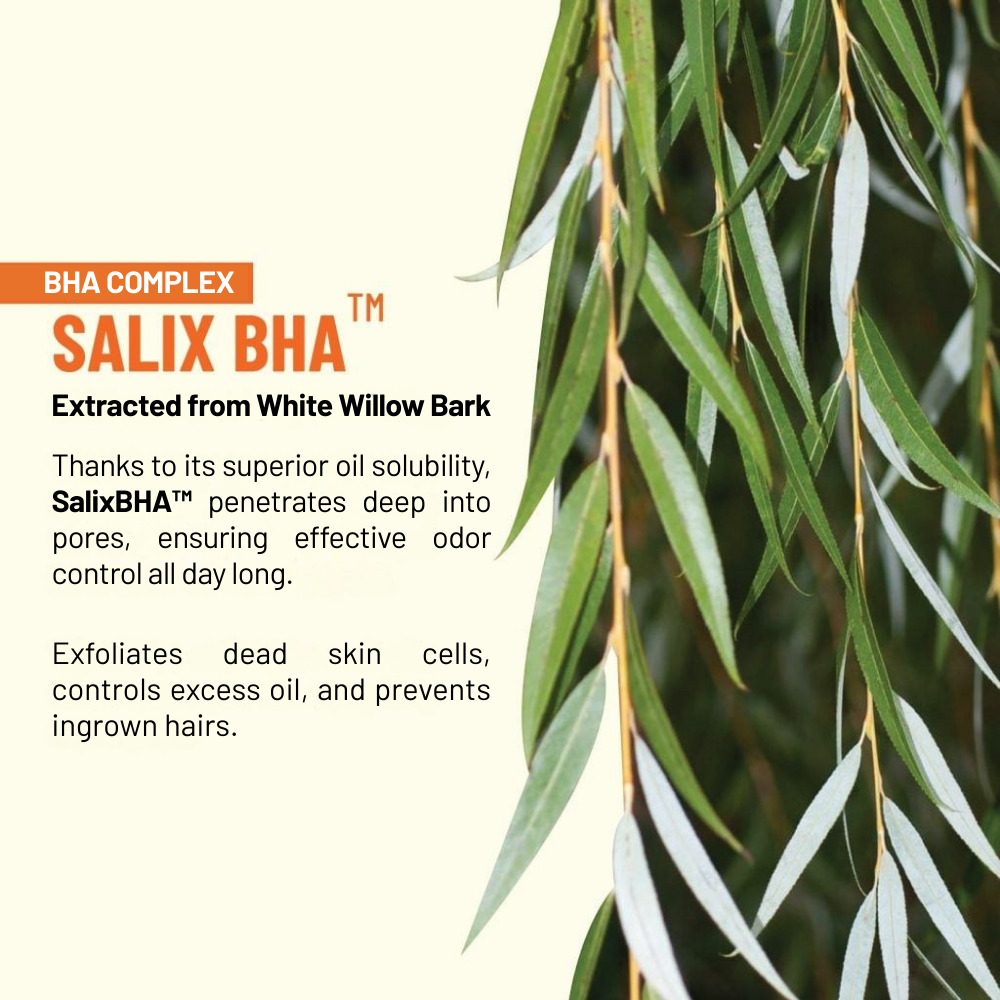SalixBHA: An exclusive BHA compound from Heebee Lab, extracted from White Willow Bark. With superior oil solubility, SalixBHA penetrates deep into pores to remove sebum and impurities, maintaining odor control all day long. Beyond its strong antibacterial properties, SalixBHA is anti-inflammatory and soothing. It gently exfoliates dead skin cells to free clogged follicles, effectively preventing and limiting ingrown hairs—a common issue in the underarm area.