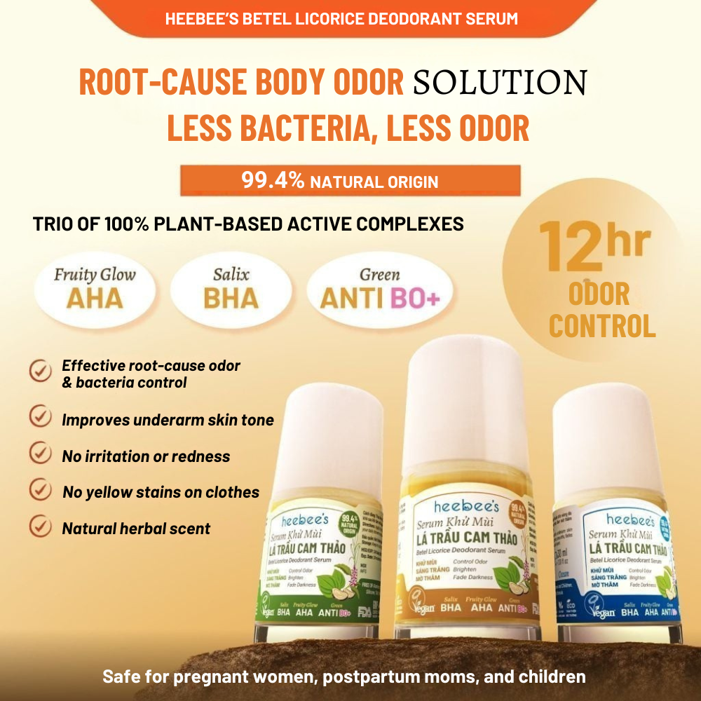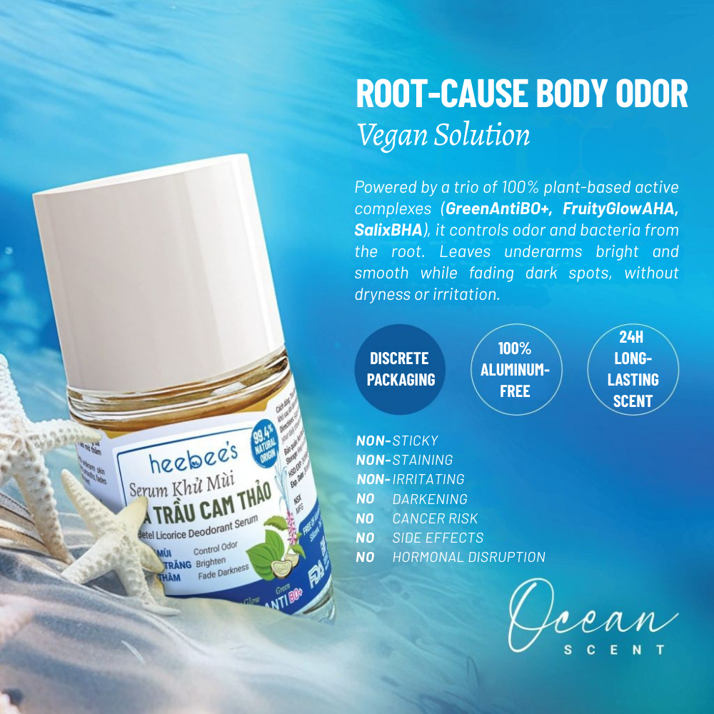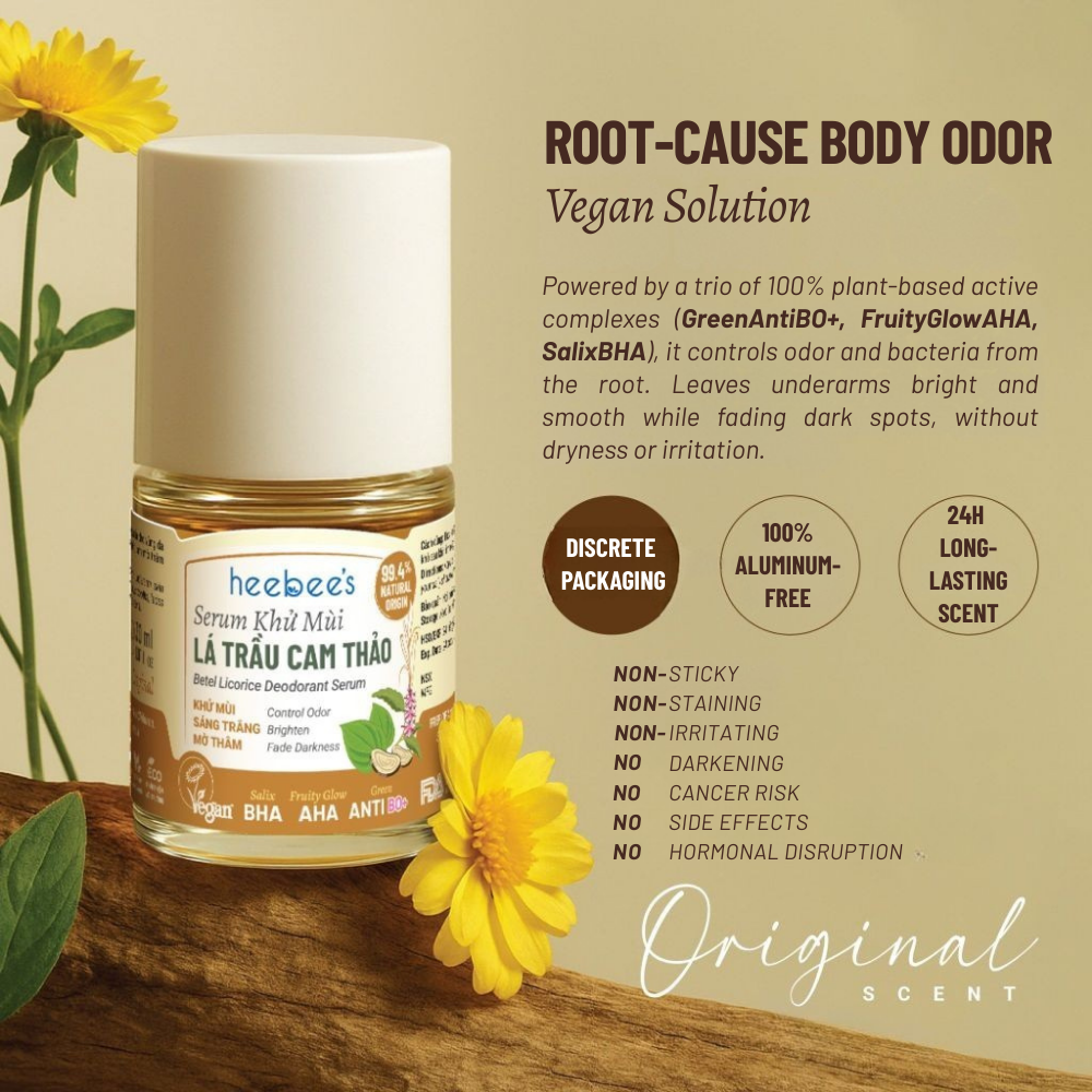 GreenAntiBO+: A pioneering achievement of Heebee Lab, designed as a new-generation vegan deodorizing shield. This exclusive formula combines plant-based acyl lactylate & triethyl citrate with the antibacterial and antifungal power of betel phenol and chavicol (from Betel Leaf & Holy Basil). Its smart selective mechanism blocks odor-causing bacteria while preserving the skin's biological balance, delivering pure, safe, and sustainable deodorizing efficacy.