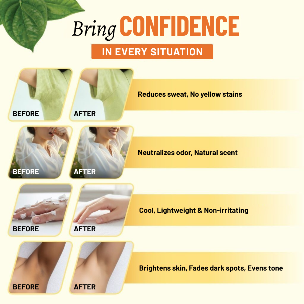 - Betel Leaf Extract: Known for its natural antibacterial and deodorizing characteristics, Betel Leaf effectively controls body odor. It also helps prevent infection-causing bacteria, keeping the underarm area clean, fresh, and dry.