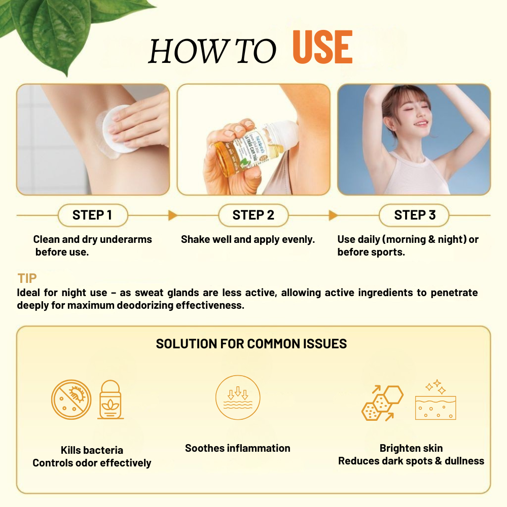 Holy Basil Extract (Hương Nhu): A precious herb in Eastern Medicine, rich in eugenol and chavicol for antibacterial, anti-inflammatory, and skin-soothing benefits. Holy Basil extract protects sensitive skin and imparts a pure, fresh herbal scent. It not only aids in controlling odor bacteria but also creates a natural equilibrium, bringing a sense of comfort and relaxation to the underarm area.