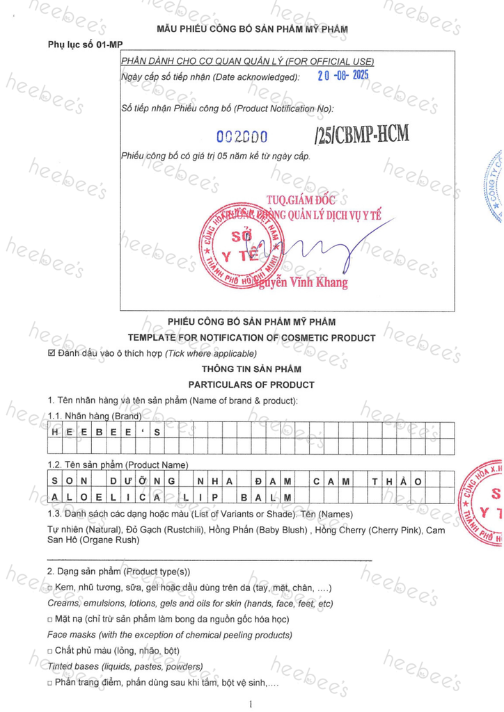 Phiếu Công Bố Mỹ Phẩm được cấp bởi Sở Y Tế