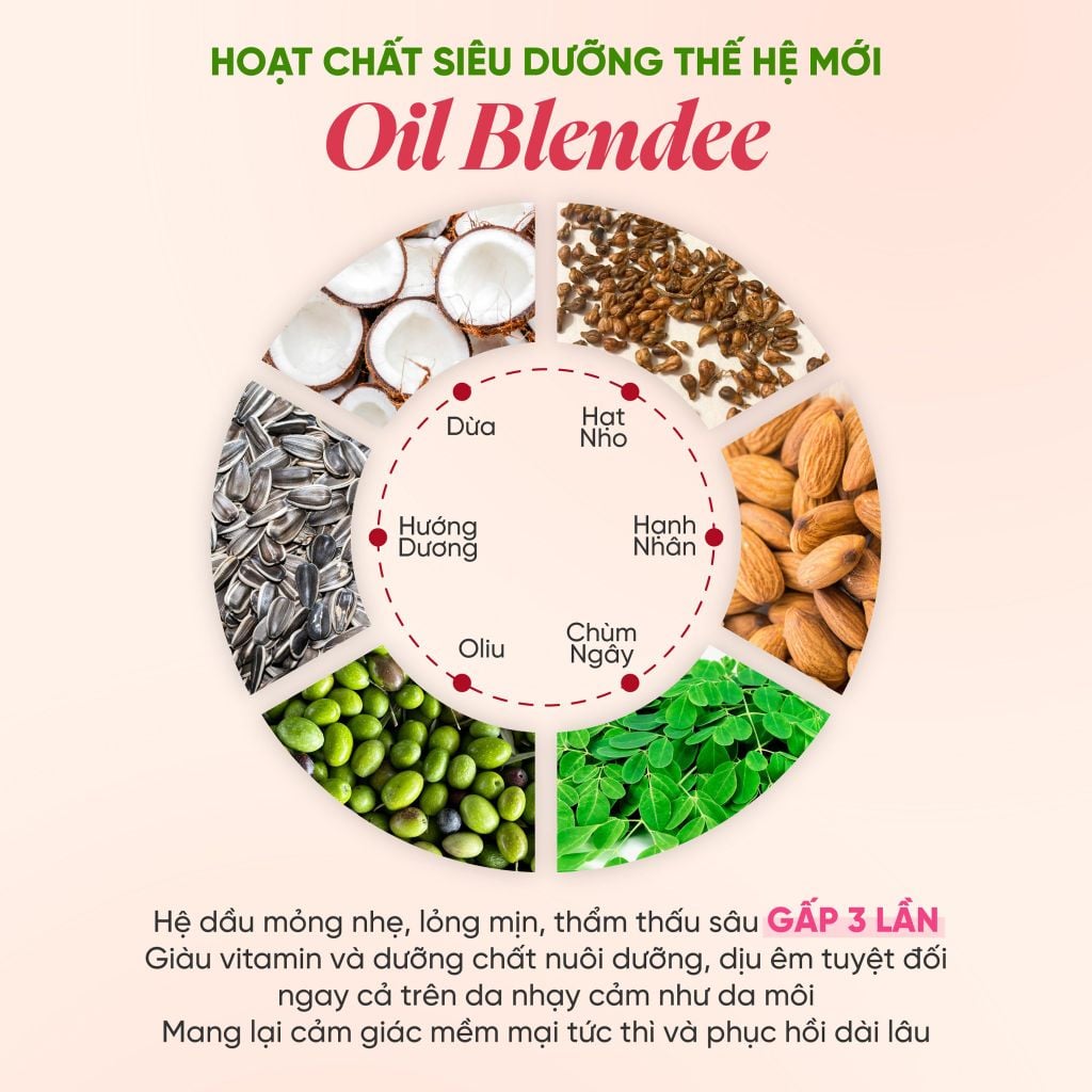 + Oil Blendee: Hoạt chất Siêu Dưỡng được chiết xuất từ 6 loại dầu thực vật bằng công nghệ trích ly xanh hiện đại, tạo nên lớp màng mỏng nhẹ, thẩm thấu sâu gấp 3 lần, đưa hàm lượng Vitamin thuần khiết trực tiếp nuôi dưỡng từng tế bào môi, mang lại cảm giác mềm mại tức thì và nuôi dưỡng dài lâu.