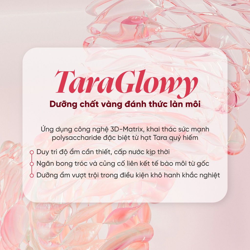 + TaraGlowy: Hoạt chất Cấp Ẩm được ứng dụng công nghệ 3D-Matrix từ hạt cây Tara quý hiếm, với cấu trúc polysaccharide đặc biệt giúp giải phóng dưỡng chất từ phôi nội nhũ, cấp ẩm tức thì, và phục hồi liên kết tế bào môi mềm mịn từ gốc. Đặc biệt hiệu quả ngay cả trong điều kiện thời tiết khô hanh.
