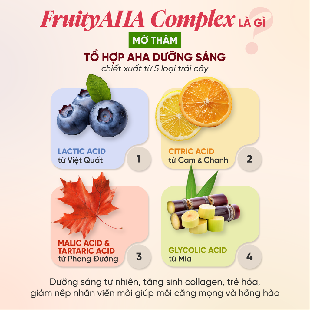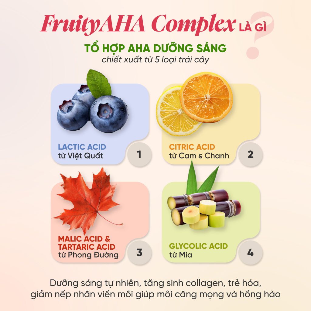 + FruityAHA Complex: AHA thiên nhiên dưỡng sáng chiết xuất từ 5 loại trái cây: Lactic Acid từ Việt Quất, Glycolic Acid từ Mía, Citric Acid từ Cam & Chanh, Malic và Tartaric Acid từ Phong Đường. Sự kết hợp này giúp làm sáng hồng môi, cải thiện sắc tố, kích thích sản sinh collagen, mang đến đôi môi căng mướt, tươi trẻ và tràn đầy sức sống.