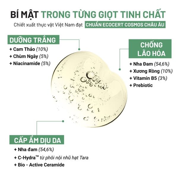 Với 99.9% thành phần thuần chay, Oil-Free & Water-Alternative (nền dịch chiết Nha Đam tinh khiết), kết cấu tinh chất nước lỏng nhẹ, thẩm thấu nhanh, an toàn tuyệt đối cho mẹ bầu và cả tuổi dậy thì. Đây là bước bứt phá giúp làn da tái sinh từ gốc, trở lại trạng thái khỏe mạnh, sáng mịn và căng tràn sức sống